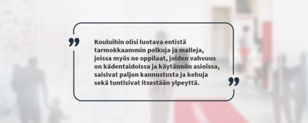 Kouluihin olisi luotava entistä tarmokkaammin polkuja ja malleja, joissa myös ne oppilaat, joiden vahvuus on kädentaidoissa ja käytännön asioissa, saisivat paljon kannustusta, kehuja ja tuntisivat itsestään ylpeyttä. Asia ei koske vain oppilaita, vaan myös vanhempia. Olemme kaukana tilanteesta, jossa kaikki voisivat kertoa samalla ylpeydellä siitä, että oma lapsi meni lukion kautta yliopistoon ja sai maisterin paperit kuin siitä, että oma lapsi meni ammattikouluun ja valmistui sellaiselle alalle ja ammattiin, jonka hän kokee omakseen.