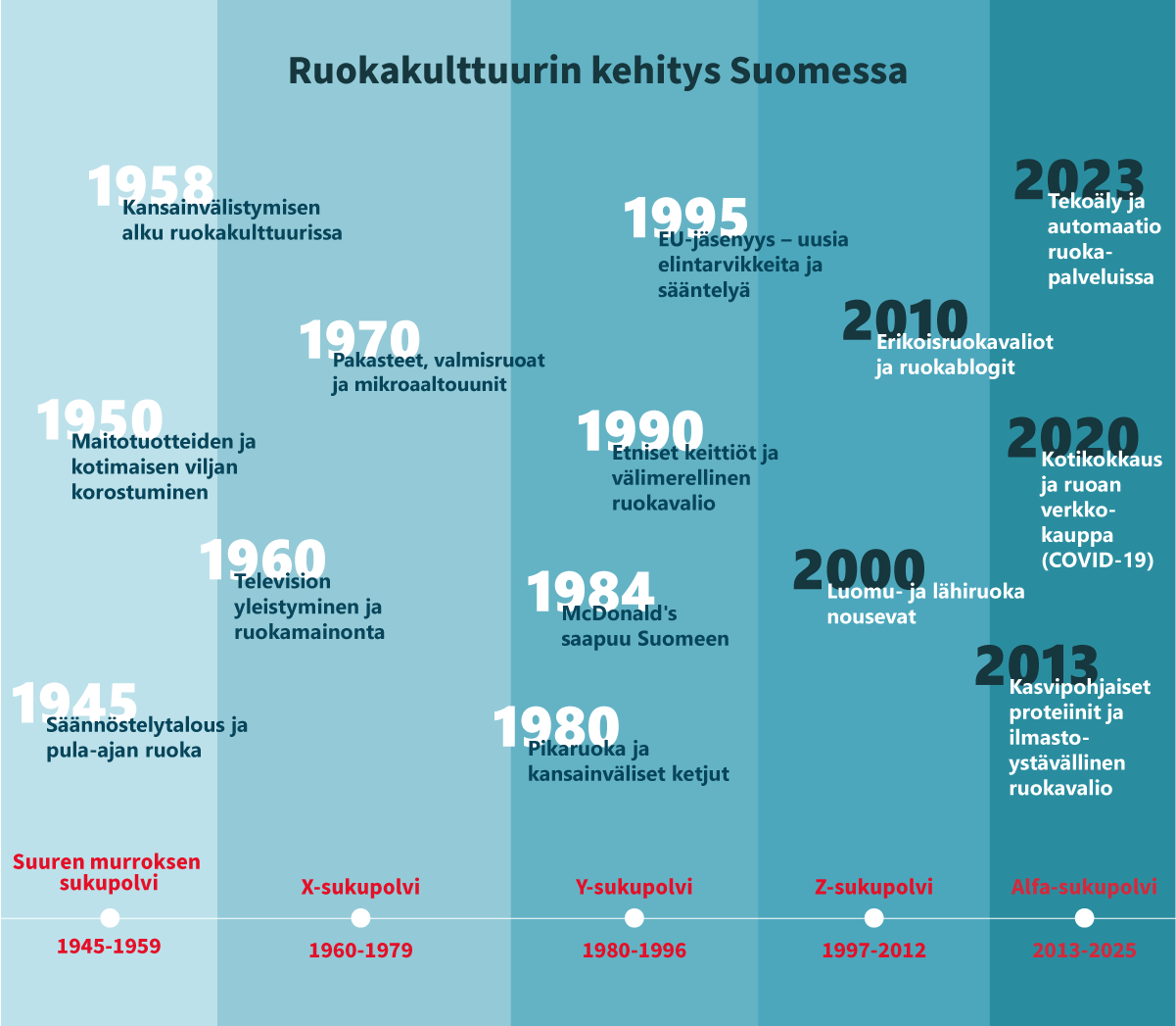 Suomi Syö -tutkimuksen jo 40-vuotiaaseen taipaleeseen sisältyy valtava määrä dataa ja tietoa ruokakulttuurin muutoksista, mutta makrotasolla, jos katsotaan esimerkiksi teknologisia kehityskulkuja ja ruokakulttuurin muutosta, voidaan havaita muun muassa: